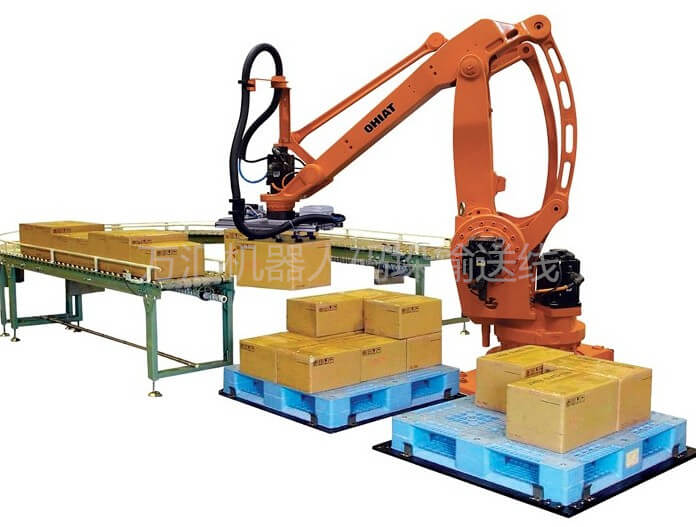 机器人码垛系统是一种智能高效的码垛机。随着工业芯片技术上的发展及AI技术的进步,机器人的智能性已经代替人类的初步劳动,机器人码垛机构灵活轻便,是工厂的明智选择
